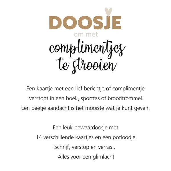 Een leuk bewaardoosje met 14 verschillende kaartjes en een potloodje. Schrijf, verstop en verras... Alles voor een glimlach!